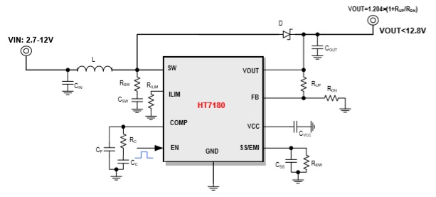 HT7180是一款高功率異步升壓轉(zhuǎn)換器,集成 22mΩ功率開關(guān)管,為便攜式系統(tǒng)提供高效的 小尺寸解決方案。 HT7180具有2.7V至12V寬輸入電壓范圍,可為 采用單節(jié)或兩節(jié)鋰電池的應(yīng)用提供支持。該器 件具備10A開關(guān)電流能力,并且能夠提供高達(dá) 12.8V的輸出電壓。 HT7180還支持可編程的軟啟動(dòng),以及可調(diào)節(jié)的 開關(guān)峰值電流限制。HT7180還支持兩種不同的 tr/tf,以適應(yīng)不同的EMI和效率需求。 此外,該器件還提供有13V輸出過壓保護(hù)、和熱 關(guān)斷保護(hù)。