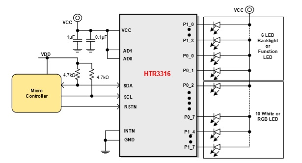 HTR33xx 是一款I(lǐng)2C 和 SMBus IO 擴 展 器 , 2.2V~5.5V電源供電。16個IO端口中的任何一個都可以單獨配置為輸入或輸出。此外,任一IO可驅(qū)動LED。 |