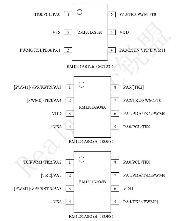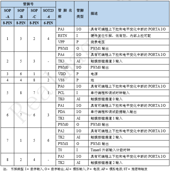 ◆ GPIO ┄ 具有獨(dú)立方向控制的 6 個(gè) I/O 引腳:PA 口 6 個(gè) ┄ PA3:外部復(fù)位,當(dāng)設(shè)定為輸出時(shí)為真開(kāi)漏輸出模式 ┄ PA 端口獨(dú)立的可編程弱上/下拉,PA 口除 PA3 外均可設(shè)定為偽開(kāi)漏輸出 ┄ PA4/PA5 為高驅(qū)動(dòng)口,能直接驅(qū)動(dòng) LED