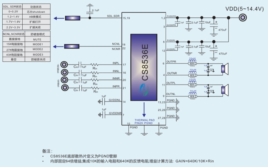 CS8536(5V-15V寬電壓供電AB/D類切換功能27W雙聲道貼片封裝音頻功放IC) |
