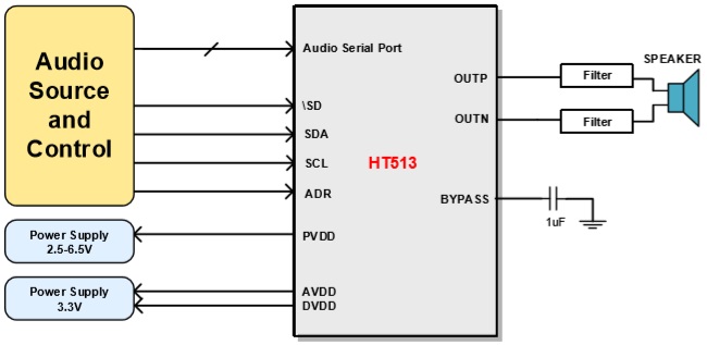 當前位置:首頁->產品展示->功放IC->HT513(I2S輸入2.8W單聲道D類音頻功放IC) |