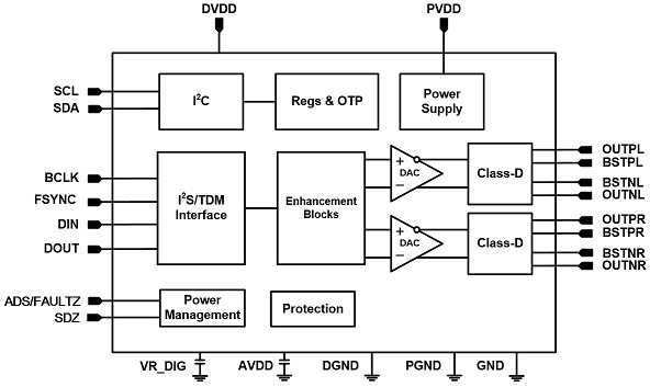 內(nèi)置虛擬低音/3D環(huán)繞音效等算法、41W立體聲/82W單通道數(shù)字輸入功放芯片 |