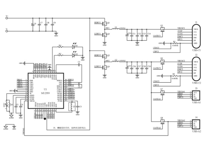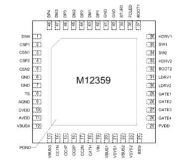 M12369 是一款面向大功率快充應(yīng)用的電源管理 SOC,集成了微處理器、雙路降壓變換器、快充協(xié)議控制 器,支持 PD3.1、QC3.0、SCP、FCP、AFC、BC1.2 DCP 等全部主流快充協(xié)議,結(jié)合少量元件即可組成雙C 口的 140W大功率快充解決方案;輔以 DC-DC 芯片,還可擴(kuò)展為3路獨(dú)立的C+C+AA多口大功率快充解決方案。