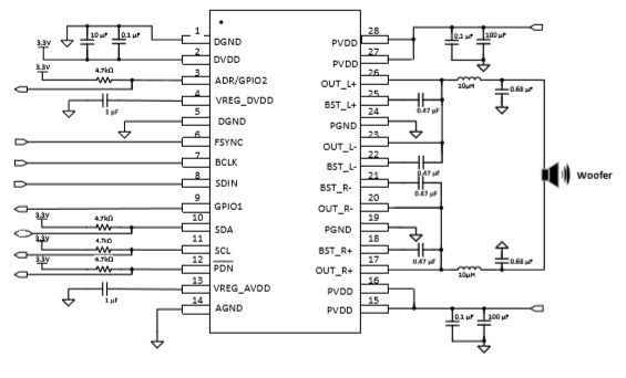 I2S數(shù)字輸入33W立體聲D類音頻功放芯片、內(nèi)置DSP小音量低頻增強(qiáng)等算法 |