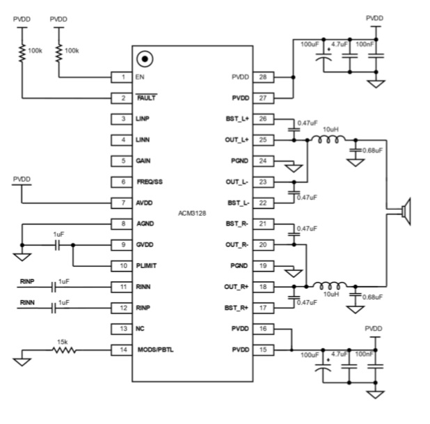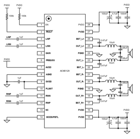 ACM3128(動(dòng)態(tài)調(diào)整升壓CLASS H功能、40W立體聲/80W單聲道D類音頻功放IC) |