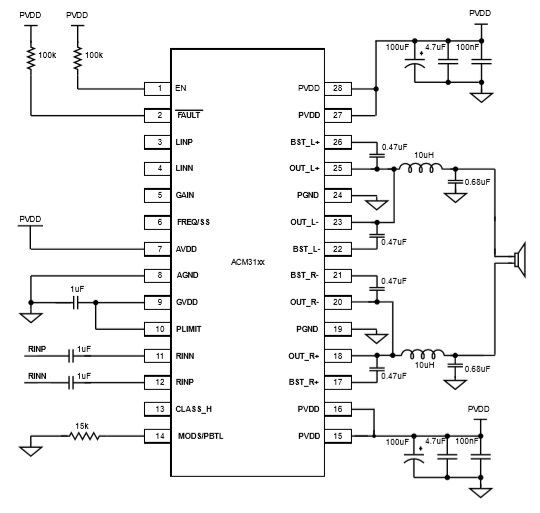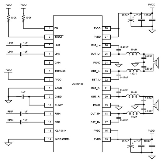 ACM3129A 在4Ω負(fù)載下可以輸出立體聲2X57W,或者單通道2Ω負(fù)載下輸出1X110W,失真度都是THD+N=1%的條件下測試。ACM3129A 是一款高效率的D類音頻功放。采用新型專利技術(shù)動(dòng)態(tài)PWM,降低全輸出段的功耗。 ACM3129A工作電壓范圍在4.5-26.4V,輸出配置可以立體聲BTL,也可以單通道PBTL。為降低EMI 噪聲,ACM3129A提供了兩個(gè)頻率的展頻選項(xiàng) (384kHz, 480kHz),在一定條件下可以免電感。 ACM3129A還提供了全差分輸入,pop音抑制,提供 4 種增益選擇等功能(20dB,26dB,30dB and 34dB)。