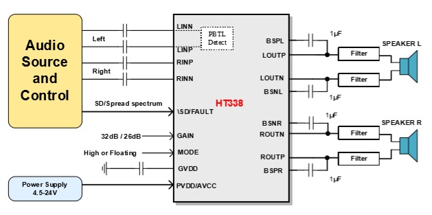 HT338(50W雙聲道/100W單聲道D類音頻功放IC) |