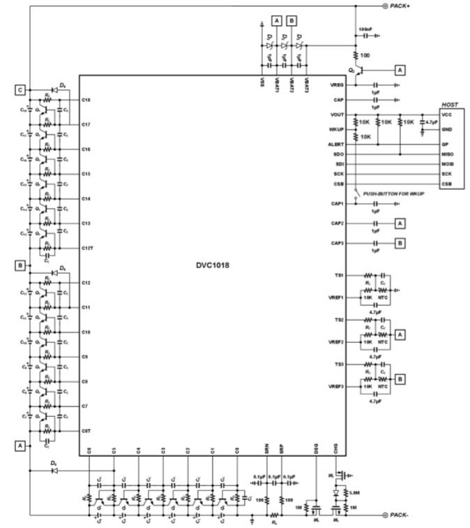 DVC1018是一款采用車規(guī)級高壓BCD工藝設(shè)計的9-18節(jié)鋰電池組監(jiān)控芯片,通過四線式SPI接口與上位機(jī)進(jìn)行通信,形成一套完整的電池組管理系統(tǒng)(BMS)。