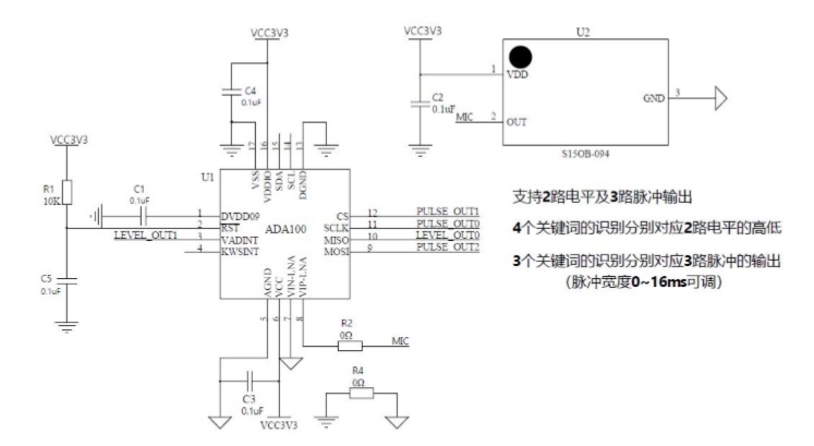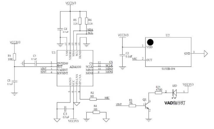 該電路適用于有 I2C 或 SPI 通信的方案,最大支持 30 個(gè)關(guān)鍵詞的識(shí)別,當(dāng)有語(yǔ)音時(shí),VADINT(PIN3)輸 出高脈沖指示檢測(cè)到人聲;當(dāng)識(shí)別到關(guān)鍵詞時(shí),KWSINT(PIN4)輸出一個(gè)納秒級(jí)別的脈沖,提示此時(shí)該讀取 ADA100 寄存器,提取識(shí)別到的關(guān)鍵詞。