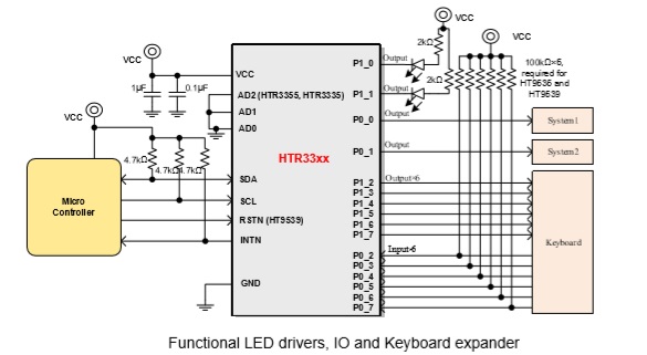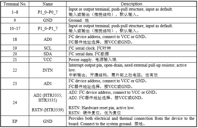 HTR3335是一款I(lǐng)2C SMBus IO 擴(kuò)展器 , 2.2V~5.5V電源供電。16個(gè)IO端口中的任何一個(gè)都可以單獨(dú)配置為輸入或輸出。此外,任一IO可驅(qū)動LED |