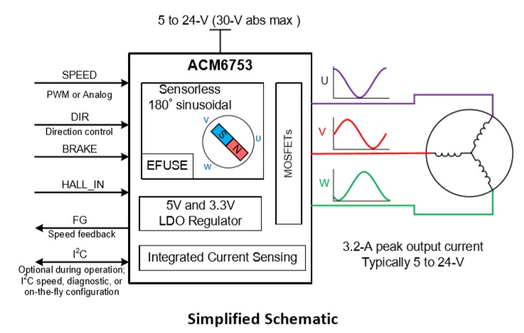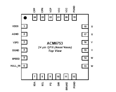 ACM6732是一款三相無刷直流電機(jī)驅(qū)動芯片,內(nèi)部集成無感三相無刷電機(jī)驅(qū)動算法、相電流檢測電流電路、柵極驅(qū)動電路以及功率MOS 管. 支持最大2.4A的相電流. ACM6732 的高集成度以及精簡外圍特別適用于高功率密度、小尺寸、靜音要求高的三相無刷電機(jī)驅(qū)動器應(yīng)用場