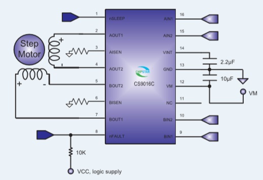 CS9016C為玩具、打印機(jī)和其它電機(jī)一體化應(yīng)用提供一種雙通道電機(jī)驅(qū)動(dòng)方案。CS9016C有兩路H橋驅(qū)動(dòng),可以驅(qū)動(dòng)兩路刷式直流電機(jī),一個(gè)雙極步進(jìn)電機(jī),多個(gè)螺線管或者其它感性負(fù)載。每個(gè)H橋的功率輸出模塊由N溝道功率MOSFET組成,用于驅(qū)動(dòng)電機(jī)繞組。每個(gè)H 橋均具備調(diào)節(jié)或限制繞組電流的電路。該器件利用故障輸出引腳實(shí)現(xiàn)內(nèi)部關(guān)斷功能,提供過(guò)流保護(hù)、短路保護(hù)、欠壓鎖定和過(guò)熱保護(hù),并提供了一種低功耗休眠模式。另外提供一個(gè)錯(cuò) 誤輸出管腳nFAULT,當(dāng)過(guò)流過(guò)溫保護(hù)的時(shí)候,nFAULT為低電平.