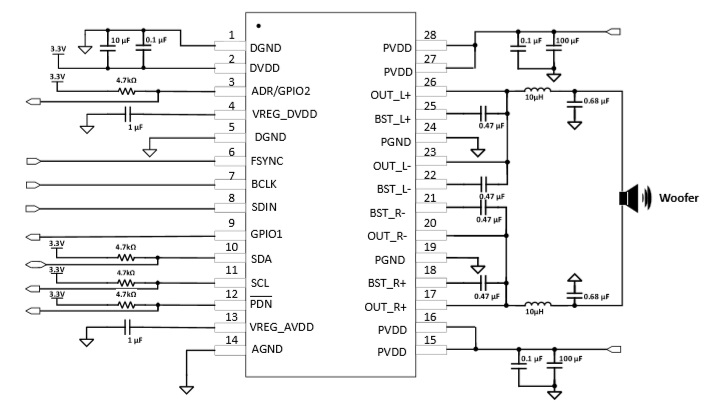 I2S數(shù)字輸入33W立體聲D類音頻功放芯片、內(nèi)置DSP小音量低頻增強(qiáng)等算法 |