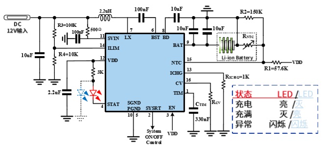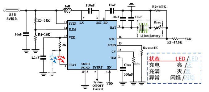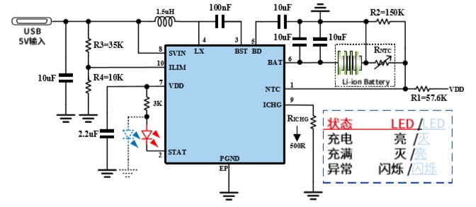 ■ LED指示燈使用時需接限流電阻到VDD,推薦3K。如需使用雙燈方案,必須按照圖中LED燈顏色配置,請購買對應(yīng)顏色LED燈進行實驗,充 電時紅燈亮,藍燈滅;充滿時藍燈亮,紅燈滅;異常時紅燈藍燈交替閃爍。