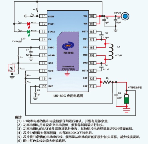 IU5180C內(nèi)置四個(gè)環(huán)路來控制充電過程,分別為恒流(CC)環(huán)路、恒壓(CV)環(huán)路、芯片溫度調(diào)節(jié)環(huán)路、可智能調(diào)節(jié)充電電流,防止拉垮適配器輸出,并匹配所有適配器的輸入自適應(yīng)環(huán)路,其輸入自適應(yīng)點(diǎn)通過外部分壓電阻靈活可調(diào)。