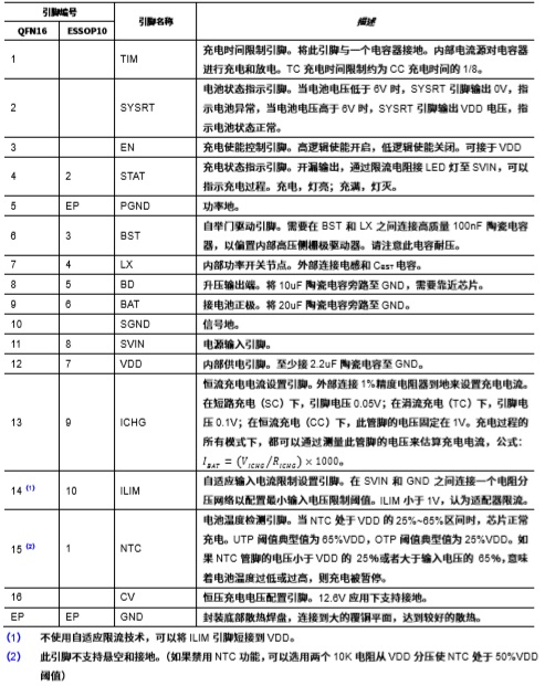 ■ NTC電阻一般位于電池內部,為方便展示,虛線框內為電池包。NTC典型應用中需使用B值為4250K的100K阻值的NTC電阻與R2(150K)電 阻器并聯(lián)再與R1(57.6K)電阻器串聯(lián)接于VDD引腳,這種搭配可保證電池在0℃~60℃區(qū)間正常充電。如使用其他搭配,請參照第13頁NTC功 能解釋中的給出的各溫度閾值區(qū)間的NTC電壓進行設計或可咨詢我司FAE。