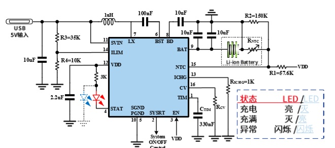 圖1. LGS55183 QFN版本典型應用 1A充電(適應4.5V USB;電池充電溫度為0℃~60℃;)