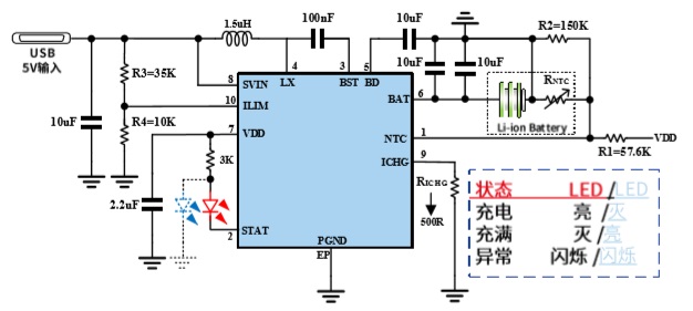 ■ LED指示燈使用時需接限流電阻到VDD,推薦3K。如需使用雙燈方案,必須按照圖中LED燈顏色配置,請購買對應顏色LED燈進行實驗,充 電時紅燈亮,藍燈滅;充滿時藍燈亮,紅燈滅;異常時紅燈藍燈交替閃爍。