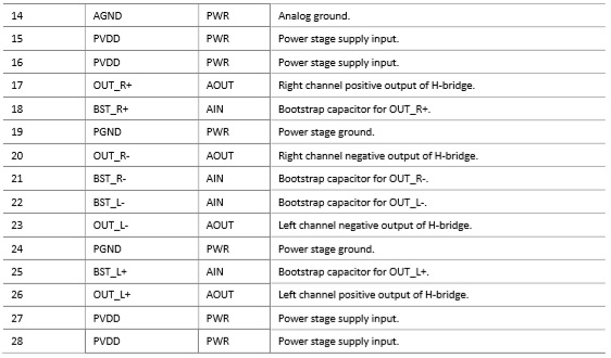 2×14W, 立體聲輸出(4Ω, 12V, THD+N = 1%); 2×10.5W, 立體聲輸出 (6Ω, 12V, THD+N = 1%) |
