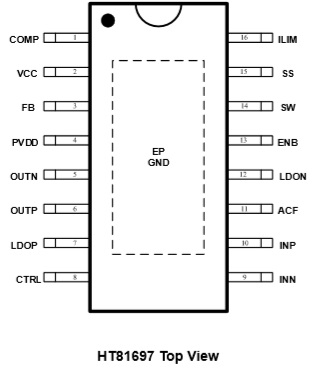 HT81697具有先進的擴頻功能來抑制EMI。如果系統(tǒng)對EMI高度敏感,則可以將升壓關閉,并將功放切換到AB類。 此外,HT81697集成了輸出端過流保護、片內過溫保護、升壓過壓保護等功能。