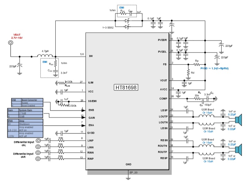 HT81698是一款內(nèi)置升壓的立體聲D類音頻功率放大器,其支持單節(jié)鋰電、雙節(jié)鋰電串聯(lián)、 5V、12V等多種輸入,升壓后的電壓提供給功放供電,功放支持雙通道立體聲BTL輸出以及并聯(lián)PBTL單聲道輸出。