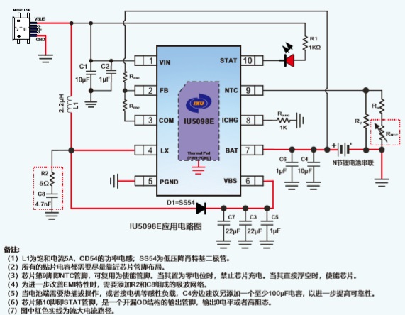 IU5098E內(nèi)置四個環(huán)路來控制充電過程,分別為恒流(CC)環(huán)路、恒壓(CV)環(huán)路、芯片溫度調(diào)節(jié)環(huán)路、可智能調(diào)節(jié)充電電流,防止拉垮適配器輸出,并匹配所有適配器的輸入自適應(yīng)環(huán)路。