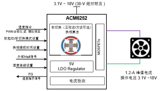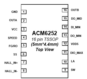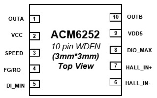 ACM6252可以在搭配一個Hall開關(guān)或者Hall元件的情況下,以正弦波或者平滑方波的形式驅(qū)動一個單相無刷風(fēng)扇 (或者水泵),內(nèi)部集成4個MOS、基于Hall輸入信號的換相邏輯電路、內(nèi)部可設(shè)置的調(diào)速曲線邏輯以及一個5V LDO.