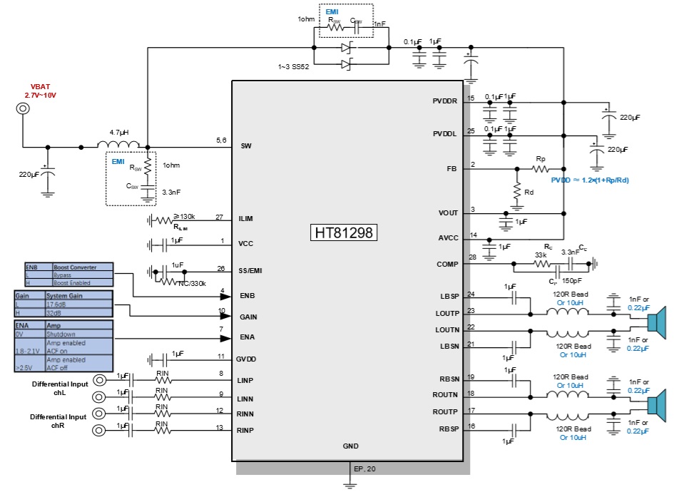 此外,HT81298內(nèi)部集成免濾波器調(diào)制技術(shù),能夠直接驅(qū)動揚(yáng)聲器,內(nèi)置的關(guān)斷功能使待機(jī) 電流最小化,還集成了輸出端過流保護(hù)、片內(nèi)過溫保護(hù)、輸入電源欠壓異常保護(hù)、升壓電壓 過壓保護(hù)等功能。