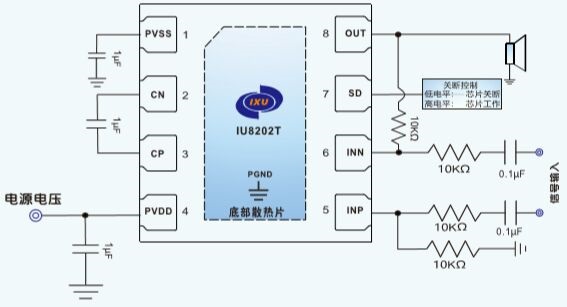 IU8202T采用單端模式輸出,其直驅(qū)模式結(jié)構(gòu)單電源供電時(shí)能夠產(chǎn)生以地為參考的輸出,從而省 去了大尺寸的隔直電容,既節(jié)省了成本和電路板空間, 也降低了元件的高度。
