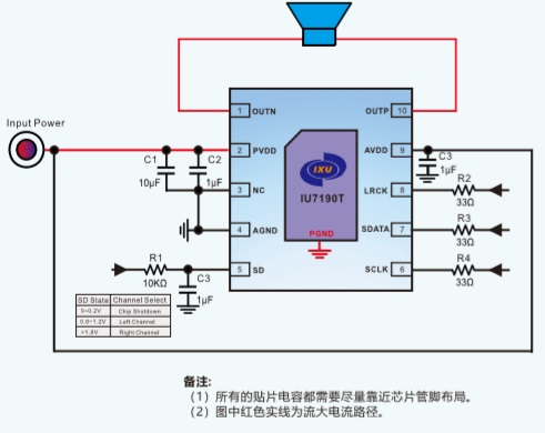 IU7190T是一款支持I2S數(shù)字音頻信號輸入、高效率、超低EMI、3.1W單聲道D類音頻功率放大器。其內(nèi)置有數(shù)模轉(zhuǎn)換器(DAC)和多級D類調(diào)制器,具備出色的音頻性能。利用芯片的I2S數(shù)字音頻串行接口傳送至放大器,可以顯 著降低噪聲源對所傳輸音頻的影響。另外也避免了主控芯片內(nèi)置音頻解碼DAC所帶來的噪聲,最終獲得較高的信噪比以及較小失真度。IU7190T閉環(huán)數(shù)字輸入設(shè)計(jì)保留了數(shù)字放大器的優(yōu)勢,同時(shí)又具有極佳的PSRR和音頻性能。