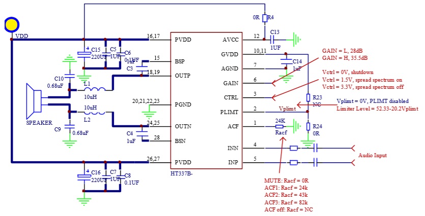 HT337B具有防削頂失真(ACF)輸出控制 功能,可檢測并抑制由于輸入音樂、語音信號幅度過大所引起的輸出信號削頂失真(破音),也能自適應(yīng)地防止在電源電壓下降所造成的輸出削頂,顯著提高音質(zhì),創(chuàng)造非常舒適的聽音享受,并保護(hù)揚(yáng)聲器免受過載損壞。