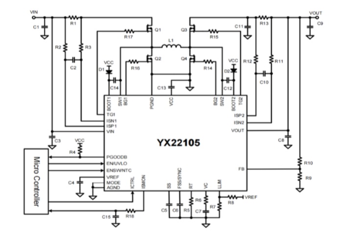 YX22105集成了具有UVLO保護功能的上管和下管柵極驅(qū)動器。它提供可編程電感峰值電流限 制和輸出平均電流限制功能,并通過ISMON提供輸出瞬時電流監(jiān)控功能。CC/CV調(diào)節(jié)功能使其適用于電池充電系統(tǒng)。