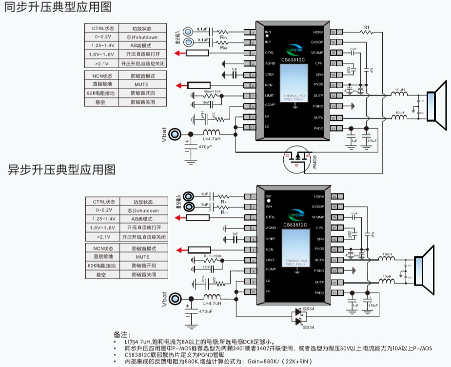 CS83812C是一款適用于1-2節(jié)鋰電池應(yīng)用,帶防破音,AB/D切換,升壓模塊同步異步可選,并且升壓模塊具備自適應(yīng)升壓功能的R類單聲道音頻功率放大器。
