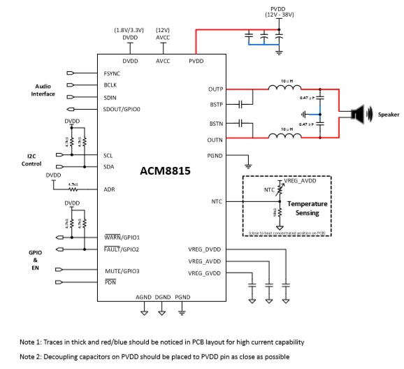 ACM8815是一款集成MOSFET,高效、高性能具有數(shù)字輸入的單聲道D類音頻放大器。外圍應(yīng)用電路只需要很少的無源元件,能在4.5V至38V的PVDD和AVCC電源、3.3V或1.8V的DVDD電源下工作。ACM8815集成了11mΩRdson-MOSFEET,驅(qū)動到4Ω可以在10%THD+N內(nèi)輸出1×200W的功率,而不需要散熱器。