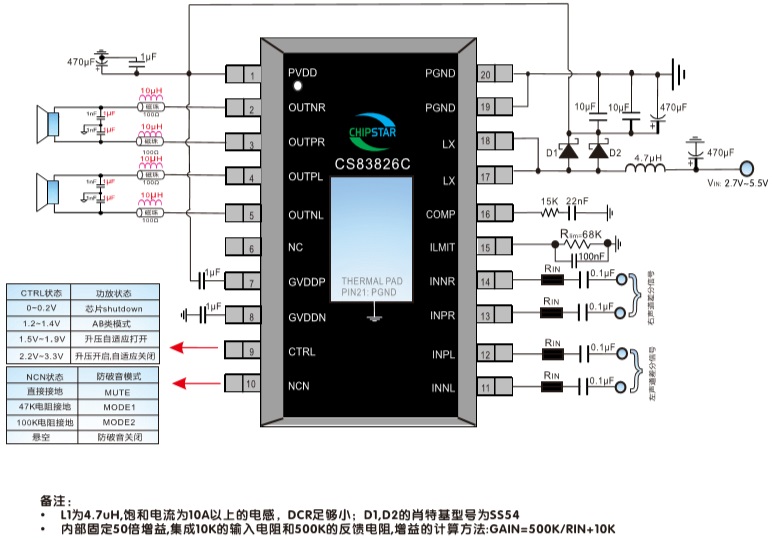 CS83826C內(nèi)置了過流保護(hù),短路保護(hù)和過熱保護(hù),有效的保護(hù)芯片在異常的工作條件下不被損壞。