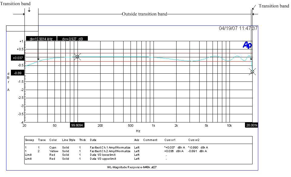 從上圖中我們可以看到整個測試結(jié)果的頻段分成二個部份,一個是Transition band,另一個是Outside Transition band,天藍(lán)色的線條代表是信號的曲線,紅色的部份則是限制范圍,用來表示曲線值正確與否,我們可以看到信號在高低頻部份開始變的不穏定而且跑出紅線范圍之外,我們稱那是一個轉(zhuǎn)態(tài)帶(Transition band)的開始,在這項(xiàng)測試有三個點(diǎn)要觀察,(1)在Pass band(Outside transition band)內(nèi)是否平順,其漣波值(Ripple)是否在紅線范圍之內(nèi);(2)在Transition band的結(jié)束點(diǎn)是否合乎規(guī)范;(3)信號進(jìn)入Transition band后是否合乎單一方向性的持續(xù)向外延伸,不能又回到紅線曲域里,業(yè)界稱此為「Monotonic」。