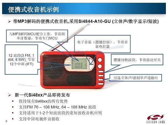 據(jù)悉,新一代Si48xx產(chǎn)品即將發(fā)布,在保持現(xiàn)有Si48xx的所有優(yōu)勢的同時,新產(chǎn)品支持FM 76-108MHz, 64-108MHz波段;支持適用于1-2個短波波段的寬短波收音機應(yīng)用;支持中國電視伴音接收。