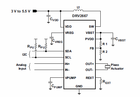 采用 4 毫米 × 4 毫米 × 0.9 毫米 20 引腳 QFN 封裝的 DRV2667 現(xiàn)已開始供貨。