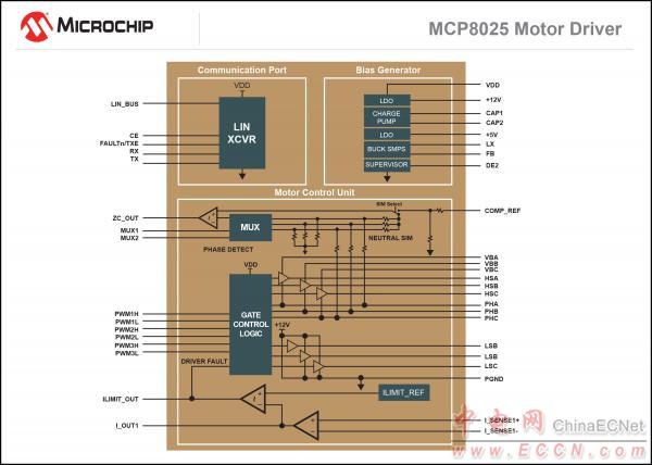 Microchip近日宣布推出兩款集成了電源拈、LIN收發(fā)器和休眠模式的三相無刷直流(BLDC)電機柵極驅(qū)動器——MCP8025和MCP8026(MCP8025/6)。這兩款器件能夠為廣泛的Microchip dsPIC® 數(shù)字信號控制器(DSC)和PIC®單片機(MCU)供電;通過驅(qū)動MOSFET,檢測電流,防止短路,輸出過零,控制死區(qū)和消隱時間,監(jiān)測過壓/欠壓、過溫和其他溫度警告等故障狀態(tài),從而對控制算法進(jìn)行補充。這種組合讓Microchip能夠為多種汽車和工業(yè)應(yīng)用提供完整的電機控制與驅(qū)動解決方案。此外,新器件可耐受150攝氏度的工作溫度、低至5 µA(典型值)的休眠電流、外加LIN收發(fā)器,使其特別適合汽車設(shè)計,如需要在引擎蓋下運轉(zhuǎn)的設(shè)計(水泵和HVAC等),或是需要降低熄火狀態(tài)功耗的設(shè)計。全新器件的片上LIN收發(fā)器符合LIN總線2.1、SAE J2602以及早先的LIN 1.X標(biāo)準(zhǔn)。