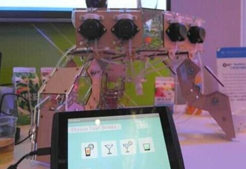 英特爾以Quark處理器推出的Galileo開(kāi)發(fā)板,以推動(dòng)各界開(kāi)發(fā)低功耗的裝置,現(xiàn)場(chǎng)展示一臺(tái)自動(dòng)調(diào)酒機(jī)器,機(jī)器連結(jié)了果汁、汽水等多種飲科,使用者只要在前方平板電腦上選擇想要的飲料后,機(jī)器就會(huì)自動(dòng)制作調(diào)配。
