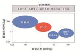 EDLC是蓄電裝置的一種,具備與鋰離子電池等二次電池相比,能量密度(單位面接的蓄電量)較差、但輸出密度(單位時(shí)間能處理的電量)較好的特征。另外,還具有反復(fù)充放電導(dǎo)致的性能劣化少(壽命長)、即使外部短路也不會(huì)產(chǎn)生故障(安全)、組成材料不含重金屬(環(huán)保)等優(yōu)勢(shì)。