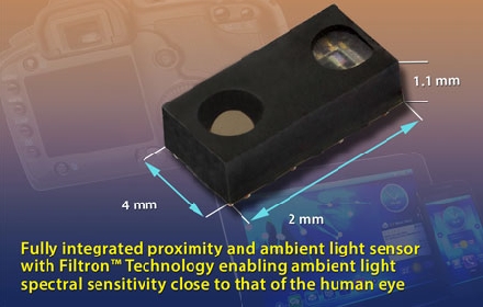 VCNL4040的環(huán)境光和接近傳感器采用并行工作方式,每個傳感器提供一個具有高閾值和低閾值的可編程中斷功能,以降低功耗。器件采用Filtron技術,使環(huán)境光的光譜感光度接近人眼,同時不需要使用微處理器就能實現(xiàn)良好的背景光消除功能(包括日光),從而進一步減少功耗。