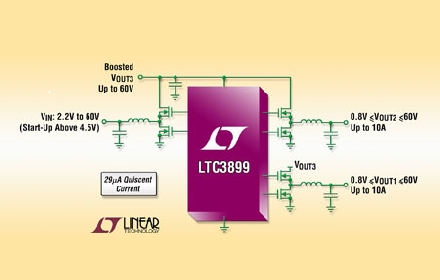 Linear推出三輸出 (降壓、降壓、升壓) 29µA 靜態(tài)電流、同步 DC/DC 控制器 LTC3899,該器件在 2.2V 至 60V 輸入范圍內保持輸出電壓穩(wěn)定。12V 汽車電池在引擎重新啟動或冷車發(fā)動時可能降至低于 4V,從而導致信息娛樂系統(tǒng)以及其他采用 5V 或更高電壓工作的電子系統(tǒng)復位。升壓型轉換器為兩個降壓型轉換器供電,從而在汽車電池電壓下降時避免了輸出電壓下降,在怠速時關閉引擎以節(jié)省燃料的汽車啟/停系統(tǒng)中,這是一種非常有用的功能。60V 最高輸入電壓涵蓋雙電池卡車應用;蛘,降壓型控制器可由輸入供電以用作通用的三路輸出控制器。