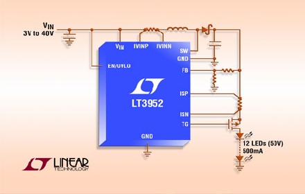 LT3952 可用標(biāo)稱的 12V 輸入驅(qū)動多達(dá) 16 個 350mA 白光 LED,從而提供超過 15W 功率。該器件包括高壓側(cè)電流檢測,允許其以升壓模式、降壓模式、降壓-升壓模式或 SEPIC 拓?fù)涔ぷ鳌?nèi)部的擴展頻譜頻率調(diào)制最大限度減輕了 EMI 問題。LT3952 在升壓拓?fù)鋾r提供超過 94% 的效率,因此無需外部散熱措施。其內(nèi)部 LED 短路保護在大多數(shù)應(yīng)用中實現(xiàn)了更高的可靠性。頻率調(diào)節(jié)引腳允許用戶設(shè)定開關(guān)頻率在 200kHz 至 3MHz,從而優(yōu)化了效率,同時最大限度減小了外部組件尺寸和成本。LT3952 在纖巧的解決方案占板面積提供了超過 90% 的效率,同時以 2MHz 頻率切換。該器件采用耐熱增強型 TSSOP-28E 封裝,提供了非常緊湊的大功率 LED 驅(qū)動器解決方案。