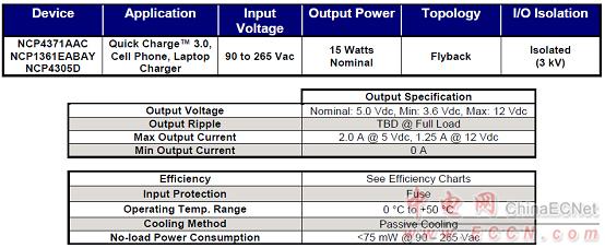 The charger design utilizes ON Semiconductor’s new NCP4371 Qualcomm Quick Charge™ 3.0 Controller, NCP1361E Quasi-Resonant Controller and NCP4305 Synchronous Rectification controller.