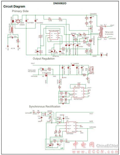 The NCP4371 resides at the secondary (isolated) side of the adapter. It includes voltage and current feedback regulation eliminating the need for a shunt regulator such as TL431.