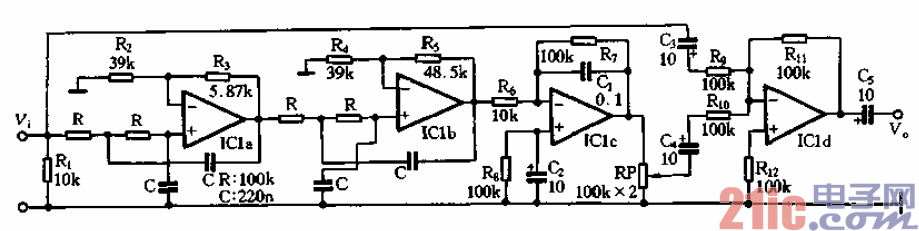 輸人信號(hào)經(jīng)ICl-a,ICl-b及外圍元件所組成的四階低通濾波器處理,其中心頻率為70Hz,衰減斜率為每倍額程24dB,增益為8.2dB。然后再由ICI-c組成的十倍緩沖放大器放大后輸出。被提升了的低頻信號(hào)與原始信號(hào)分別由白、C4送ICl-d混合處理后送人功率放大器。低頻信號(hào)與原始信號(hào)混合的量可由RP調(diào)節(jié),為了保證電位器RP關(guān)完后(低音信號(hào)混合量最。┰夹盘(hào)的保真度,ICl-d混合放大器的增益設(shè)計(jì)為OdBo