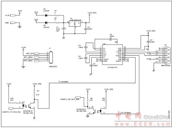 – USART communication using ST3232C, insulated with optocouplers;
