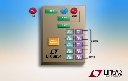 Linear推出低相位噪聲整數(shù)N合成器LTC6951,該器件集成了 VCO 和超低抖動時鐘分配電路,非常適合為數(shù)據轉換器提供時鐘。LTC6951 提供 4 個高性能電流模式邏輯 (CML) 輸出,每個輸出都配備了一個獨立的低噪聲時鐘分頻器和數(shù)字延遲構件,以涵蓋從 1.95MHz 到 2700MHz 的寬頻率范圍。當以高輸入頻率和快速輸出數(shù)據傳送速率為數(shù)據轉換器提供時鐘時,憑借總的115fsRMS絕對抖動 (SNR 方法),LTC6951 可提供實現(xiàn)最佳 SNR 所必需的低抖動時鐘。