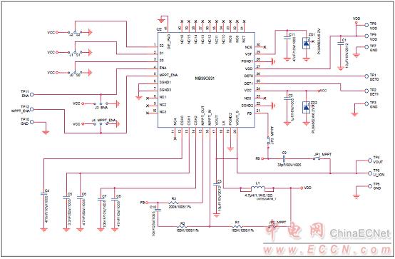 Cypress公司的MB39C831是高效率同步整流升壓DC/DC轉(zhuǎn)換器,包括控制DC/DC轉(zhuǎn)換器輸出跟隨太陽能電池的MPPT和鋰電池安全充電的保護功能,輸入電壓0.3V 到 4.75V,輸出電壓調(diào)整范圍3.0V到5.0V,無負載時的靜態(tài)電流41μA,主要用在太陽能收獲,熱能收獲,手持音頻播放器,手機,電子書,電子詞典,無線遙控控制器和傳感器節(jié)點.本文介紹了MB39C831主要特性,框圖,恒壓模式和充電模式應(yīng)用電路,以及評估板MB39C831-EVB-03主要指標(biāo),框圖,電路圖,材料清單和PCB設(shè)計圖.